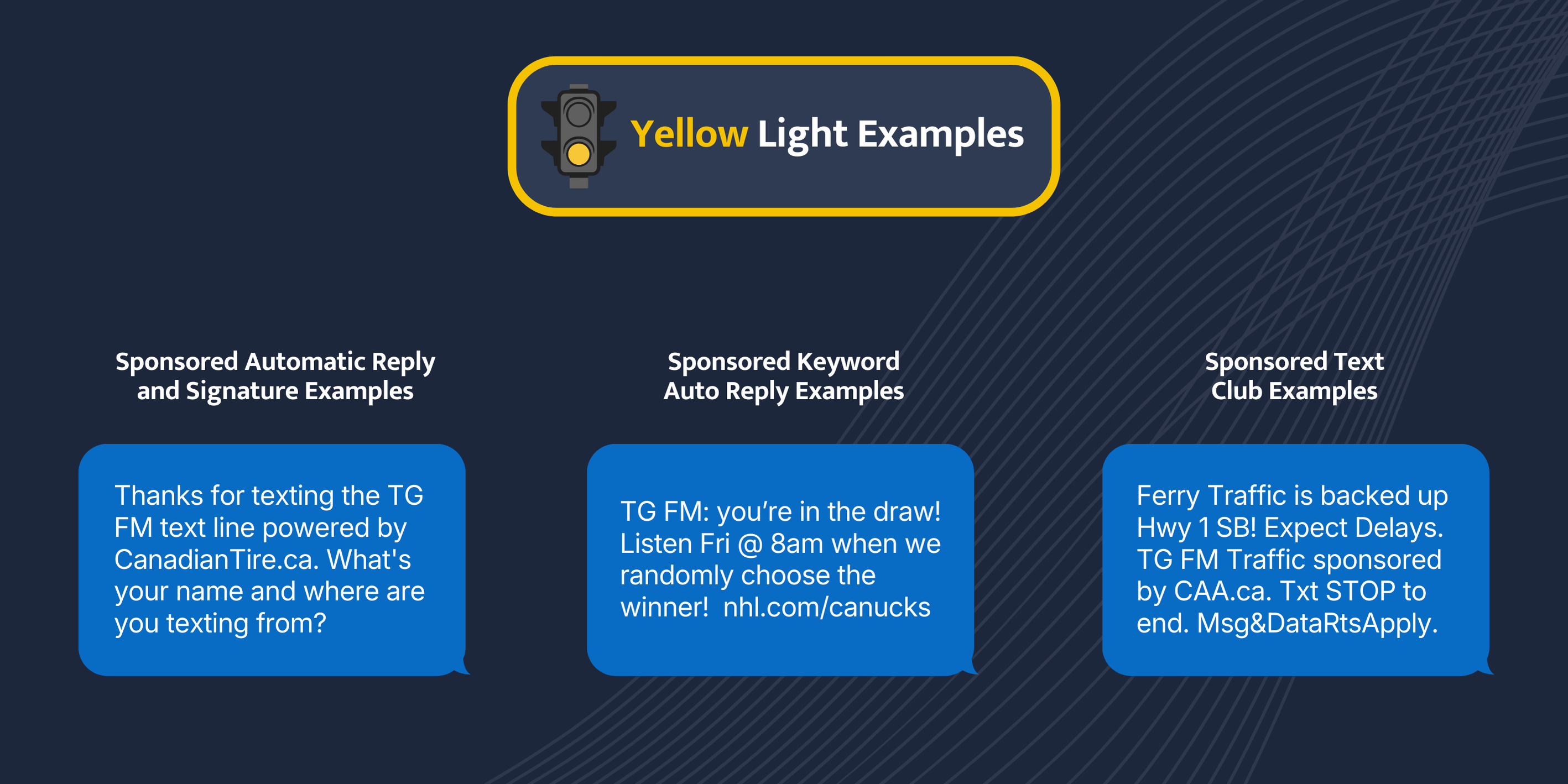 Not allowed on a station-owned text line. These patterns are likely to be filtered, blocked, or cause compliance issues. See the note at the bottom of the article if a sponsor wants their own dedicated text line.