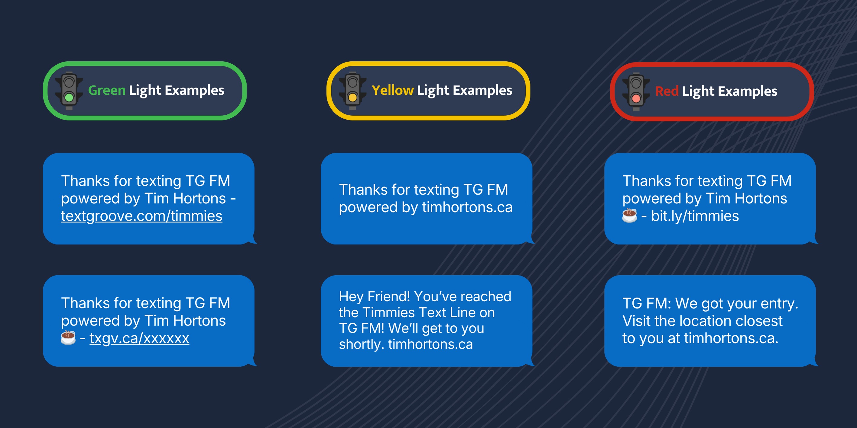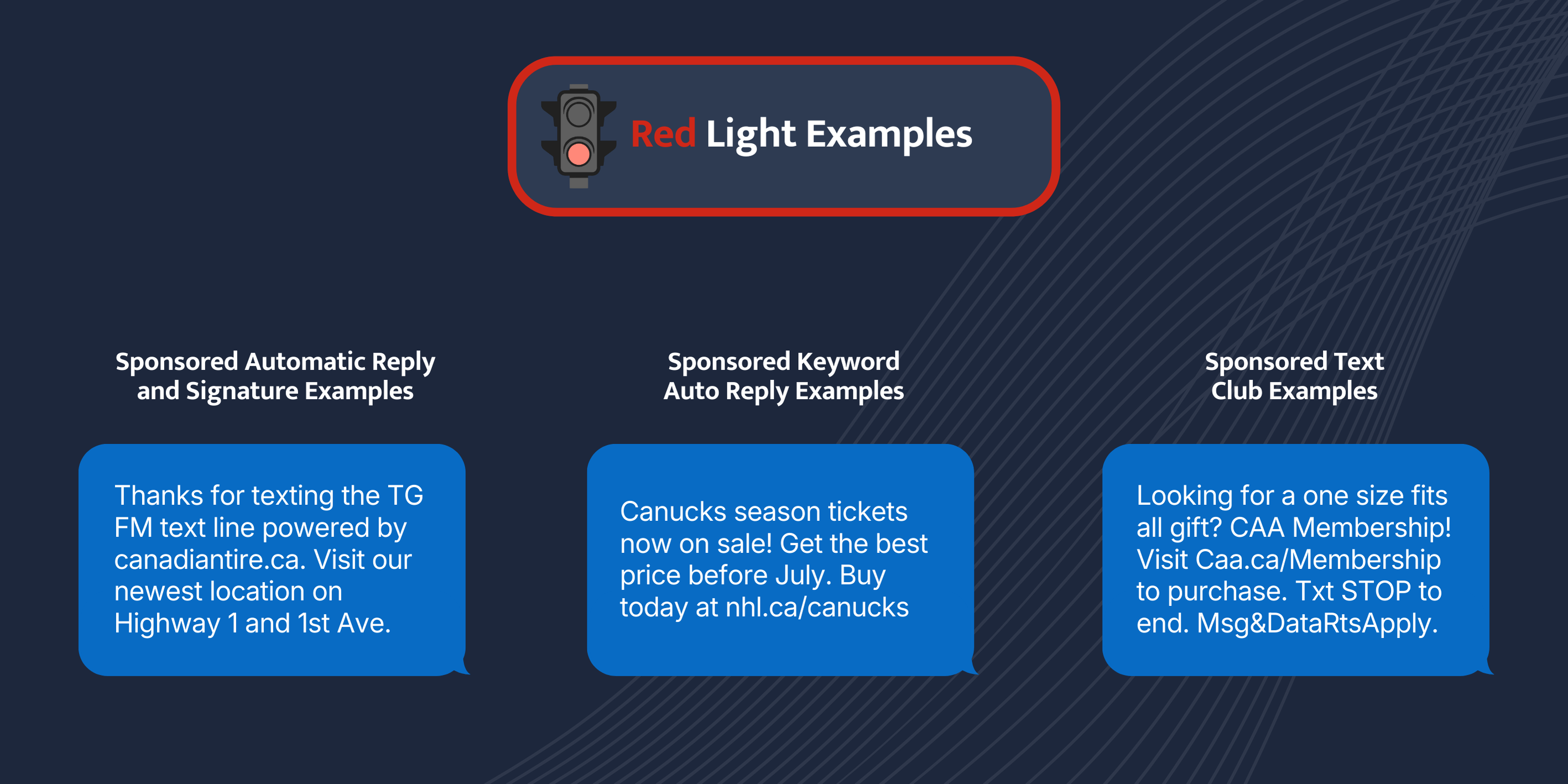 These patterns cross the line for a station-owned text line and are likely to be filtered, blocked, or suspended.